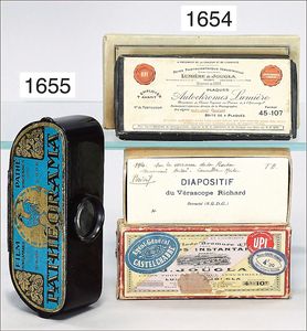 Stereoskop-Betrachter, mit Orig.-Aufnahmen, 13 cm breit, ca. 1910, dazu 3 Schachteln Orig.-Aufnahmen Autochroms Lumiere