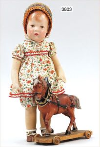 KÄTHE KRUSE Hampel, Stoffkopf, 3 sichtbare Hinterkopfnähte, lose angenähte Beine und Arme, braune gemalte Augen, 42 cm, unbespielter Orig., Zustand