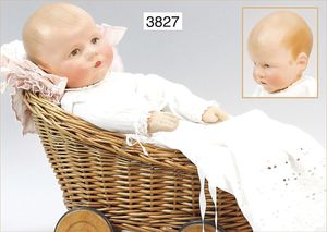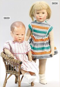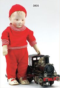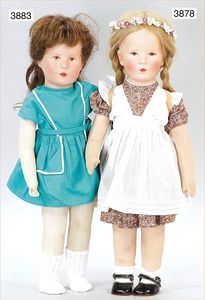 K & R Typ KÄTHE KRUSE, 1911, von K & R die Lizenz zum Herstellen einer KK-Puppe, Puppen verkauften sich schlecht auf dem Markt, sodass die Produktion wieder eingestellt wurde, K & R Toddlerkörper, kompl. farbl. überarbeitet, ausmodellierte gemalte Haare, gemalte Augen, geschl. Mund, 43 cm, sehr selten