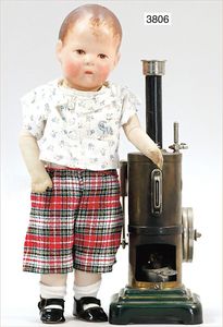 BING Puppe, ca. 1920, Stoff-Kopf, bemalt, Orig.-Kleidung und -Mohairperücke, 27 cm, Schuhe neuer, gut erhalten