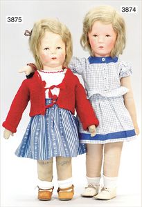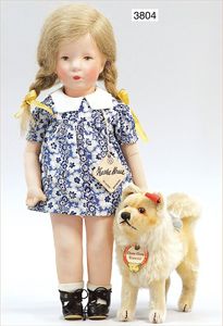 KÄTHE KRUSE Puppe Nr. 1, 42 cm, Stoffkopf, 3 Hinterkopfnähte, breite Hüfte, separat angenähter Daumen, Druckstelle auf der Stirn, schöner Orig.-Zust., Orig.-Kleidung, mit kl. Heft KK-Puppen, "Wenn ein Kind als ganz besonderes liebreizend bezeichnet werden soll, so sagt man es sieht aus wie eine KK-Puppe", 12 Seiten, mit kl. Einrissstelle