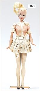 HAUSSER Bild-Lilli, 30 cm, Orig.-Frisur, bespielter Orig.-Zust., Kleid altersbed. Verschlissen, kl. Spannungsriss am Hals, 1 Daumen fehlt, an den Beinen farbl. teilw. etwas ausgeblichen