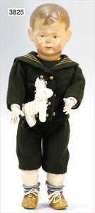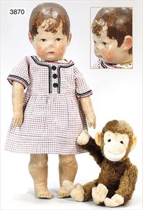 ERICH KLOTZER 1927, Charakterpuppe, 46 cm, Papiermaché-Kopf, ausmodellierte Haare, gemalte Augen, Stoffkörper, separat angenähter Daumen, alte Kleidung, sehr schöner Orig.-Zust., ausgef.