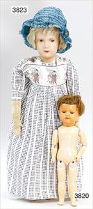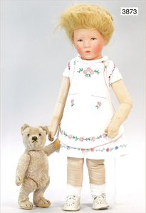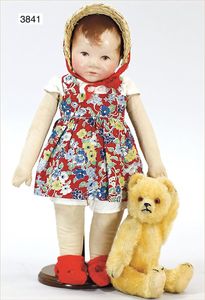 DORA PETZOLD Künstlerpuppe, ca. 1930, 65 cm, Massekopf, gemalte Augen, geschl. Mund, Mohairperücke, Stoffkörper, alte Kleidung, alte Schuhe, guter Zust., farbl. Überarbeitet