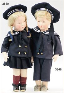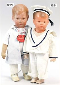 KÄTHE KRUSE Ilsebill, deutsches Mädchen, Stoffkopf, deutlich sichtbare Hinterkopfnaht, leicht eingeknickte Beine, Käthe Kruse-Schriftzug mit rotem Stempel auf der Schuhsohle, ein wenig Farbabrieb an den Lippen, Matrosenkleidung, alte Schuhe, guter Zust.