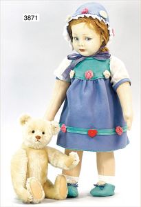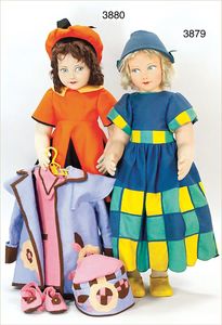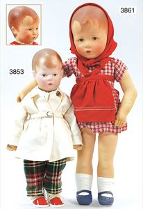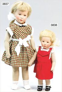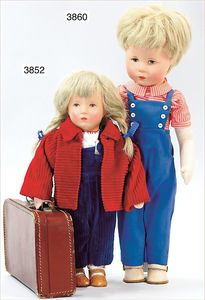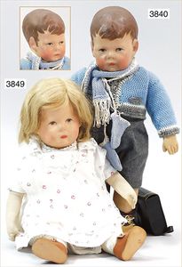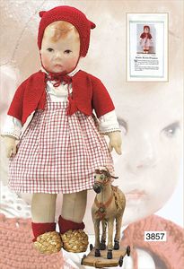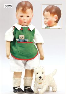 KÄTHE KRUSE Friedebald, Stoffkopf, Naht erst unter der Perücke sichtbar, Echthaarperücke, 48 cm, an den Kniekehlen abgenäht, alte Kleidung