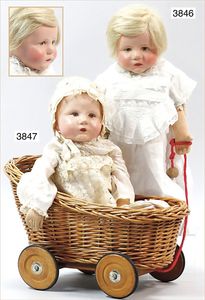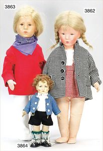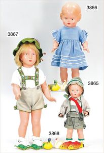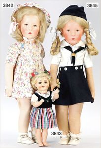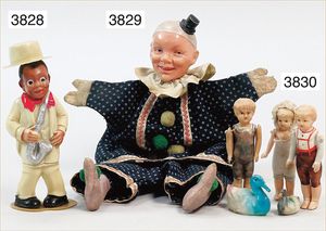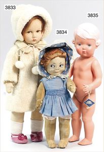 3 Teile Celluloid, MINERVA Junge, fein ausmodellierte Haare, gemalte Augen, bewegl. Arme und Beine, anmodellierte Schuhe und Strümpfe, Orig.-Karton, Aufschrift: bekleidete Celluloid-Gelenk-Puppe, dazu 1 SCHILDKRÖT Puppe, kl. MINERVA Puppe, Orig.-Kleidung, ca. 1920