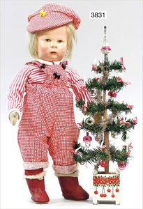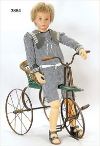 KÄTHE KRUSE Schaufenster-Puppe, Junge, 1,15m groß, Magnesitkopf, gemalte Augen, angesetzte Wimpern, Orig.-Perücke mit Druckknöpfen, kl. Stellen etwas ausgebessert, gegliederter Körper, mit bewegl. Rumpf und einknickbaren Beinen, Draht in den Armen lose, Hände stärker berieben