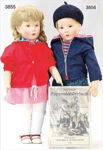 KÄTHE KRUSE Friedebald, 48 cm, deutl. Sichtbare Hinterkopfnaht, Augenbrauen nachgezogen, etwas Farbabrieb an der Nasenspitze und der li. Wange, Kniekehlen abgenäht, Stoff am Halsansatz unterschied zum Rumpf, dazu Kleidungsstücke und ein Kleiderbuch mit Schnitten für KK-Puppen