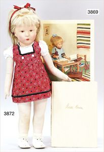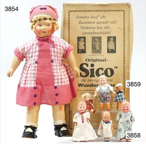 SICO Die Wunderpuppe, im Orig.-Kart., mit Laufvorrichtung und Mamastimme, Masse-Kopf mit blauen gemalten Augen, fest aufgesetzte Perücke, Stoffkörper, mit Holz-Unterarmen und Masse-Beinen, 42 cm, alte Kleidung und Schuhe, unbespielt