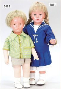 KÄTHE KRUSE Du-Mein, Magnesitkopf, minimale Krakeleebildung an Kinn und Nase, schöne Bemalung, grüne gemalte Augen, blonde Perücke, beschwerter Körper und Kopf, Poloch, Bauchnabel, Hände berieben, roter Stempel an der Sohle, 45 cm, guter Zust