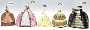 Porzellan-Halbpuppe, glasiertes Porzellan mit schön modellierter Frisur, mit Drahtgestell (Lampenschirm), Stoff bezogen, 38 cm
