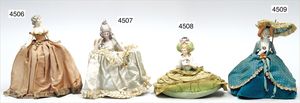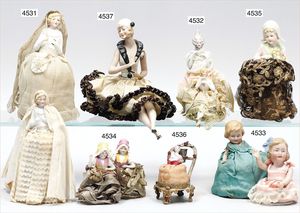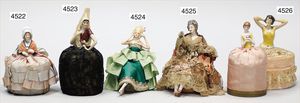 Porzellan-Halbpuppe, glasiertes Porzellan mit schön modellierter Frisur und Haube, auf Dose, Stoff bezogen, zum Öffnen, separate Porzellan-Beine, mit goldenen Schuhen, Höhe 18 cm, gemarkt 9019
