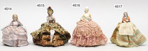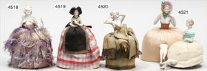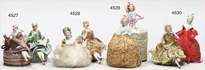2 Porzellan-Halbpuppen, glasiertes Porzellan mit schön modellierten Hüten, Stoff bezogen, Porzellan-Beine mit goldenen Schuhen, Höhe je 12 cm