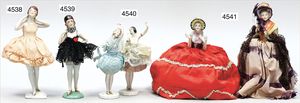 3 Porzellan-Halbpuppen, glasiertes Porzellan, 1 x Tänzerin, gemarkt 7144, 6 cm, 1 x gemarkt 5176, 6 cm, 1 x modellierter Hut, 5 cm