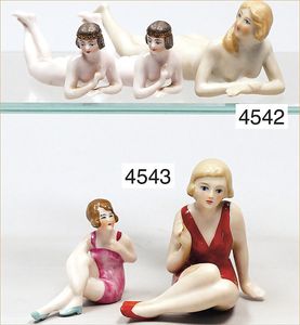 3 liegende Damen, Biskuit-Porzellan, modellierte Frisuren, 2 x gemarkt Dressel, Kister & Co., je 10 cm, 1 x ungemarkt, 15 cm