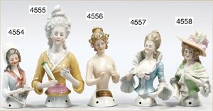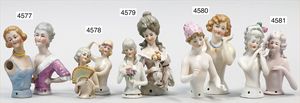 2 Porzellan-Halbpuppen, glasiertes Porzellan, 1 gemarkt Deutschland, modellierte Haube mit Schleife, kl. Ausbruch am unteren Rand, 10 cm, 1 x gemarkt Made in Germany, modellierte Haube, 11 cm,