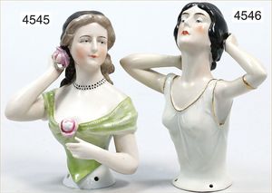 2 Porzellan-Halbpuppen, glasiertes Porzellan, mit schön ausmodellierter Frisur, bewegl. Arme, 1 x Kopf seitl. blickend, mit anmodellierter Schleife, 10 cm, 1 x seitl. blickend, 12 cm