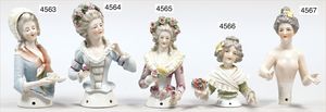 2 Porzellan-Halbpuppen, schön modellierter Frisur, Stoff bezogen, separat Porzellan-Beine, auf Porzellan-Sockel, beides gemarkt SP660, 1 Fingerspitzen weggebrochen, 18 cm