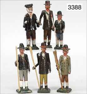 ERZGEBIRGE 5 Teile, Flößer, 12 cm, Holz geschnitzt, angedeutete Nase, kleine Stellen ausgebessert, 2 Paddel ergänzt, ca. 1890