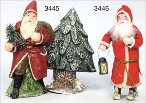 3 Teile, 1 x Candycontainer, Pappmache, beflockt, 11 cm, mit Zylinder, 1 x Schneemann, bemalte Watte, mit Zigarre, 1 x Weihnachtsmann, Watte mit Oblaten-Gesicht, Rute und Sack, 11 cm bis 16 cm