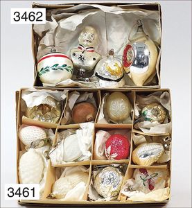 13 Teile Christbaumkugeln, Spiegelglas, versch. Motive, 4 cm bis 8 cm, darunter 1 Milchglas Fliegepilz und 1 Watteschneemann auf Ski, mit Zylinder, 60er Jahre
