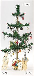 Federbaum, dekoriert mit alter Kette und alten Christbaumschmuck-Teilen, ca. 60 cm hoch einschl. Sockel, sehr guter Zust.