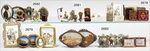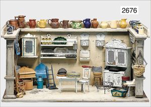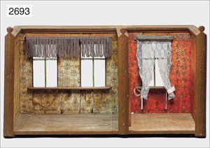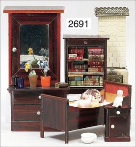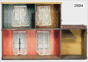 2-teilige Puppenstube, 1,11 m breit, 44 cm hoch, 45,5 cm tief, Orig.-Außenbemalung, alte Tapete an Wand und Boden, 3 Fenster, Vorhang, Verzierungen, Messingblech vergoldet, möbliert, mit herrschaftl. Gründerzeit-Möbeln, Spiegel, Schrank, Kommode mit Aufsatz, Höhe 27,5 cm, Sitzgruppe mit umbautem Sofa, hinten verspiegelt, dazu passend Schlafzimmer, reichh. Zubehörteile, Zinn, Blech, Porzellan, 1 Puppenstuben-Puppe
