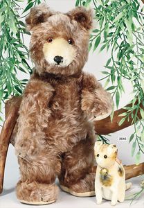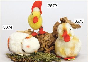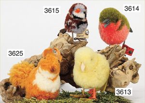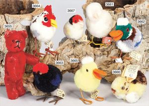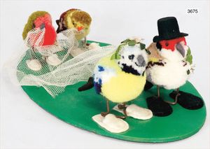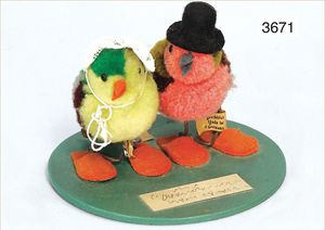 STEIFF Gratulanten-Paar, ausgefallenes Teil der Steiffproduktion, Wollminiaturen, Vögel auf Karton, Nr. 6508 P mit Knopf, mit Knopf und Fahne, Nr. 6508,1, ca. 1940, Nomotta-Wolle, bunt, Filz Zylinder, Schnabel, Schwanz, Metallbeine mit Filzpantoffeln, stehend, ausgefallen, unbespielt