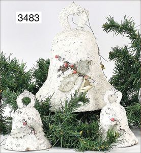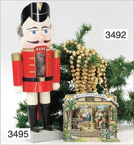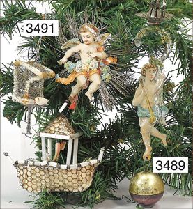 Konv. Christbaumschmuck, 2 Baumanhänger Zwerge, 6,5 cm und 10 cm, dazu Glaskugel mit Guckloch, flacher Boden, dazu 2 untersch. Oblaten mit Papiermaché-Gesichtern