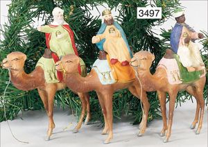 ERZGEBIRGE Heilige drei Könige auf Kamelen, gedrückte Masse-Figuren, in Orig.-Verp., für Pyramidenbestückung o. Weihnachtskrippe, Höhe Figuren ca. 15 cm, Verp. etwas eingerissen