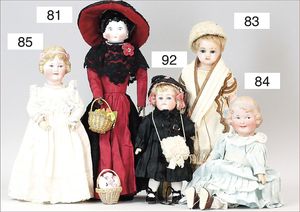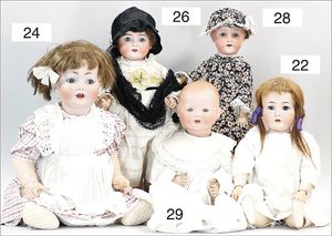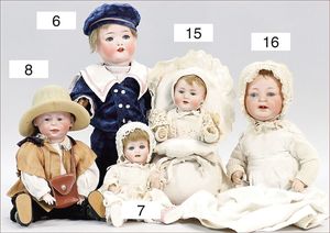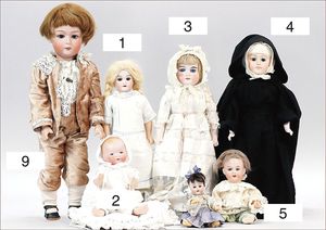 Porzellankopf-Puppe, gemarkt Germany 99/5, blaue Schelmenaugen, off. Mund, 2 Zähne oben, bewegl. Zunge, Nasenlöcher, Echthaarperücke fest aufgeklebt, von außen keine Risse erkennbar, bitte Transportrisiko für den Augenmechanismus beachten, auf Masse-Sitzb