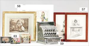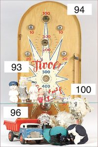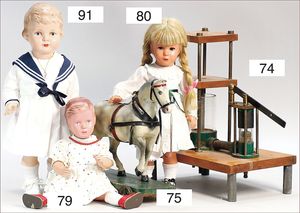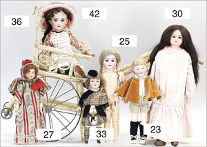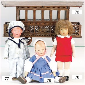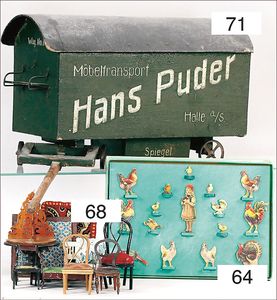 Fundkiste, kl. Puppenstubenwagen, Zinn, 8 cm, mit 3 kl. Porzellanpüppchen, kl. Badepuppe, 11 cm, Junge, Porzellan-Spardose, Nr. 12962, Porzellanpüppchen mit Haube, kl. Kewpie, 1 Celluloid-Püppchen, modellierte Frisur, bewegl. Arme und Beine, anmodellierte