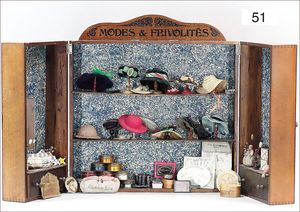 Modeladen, Schränkchen zum Aufklappen, wohl Eigenbau, Maße geschlossen 50 cm x 45 cm, reichhaltig bestückt, mit schönen Hutnadeln, Borten, Hüte, alte Knöpfe, u.v.m.