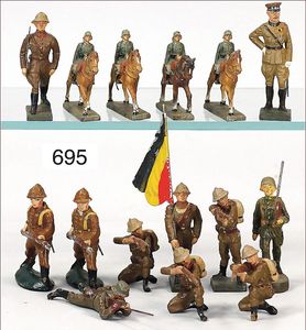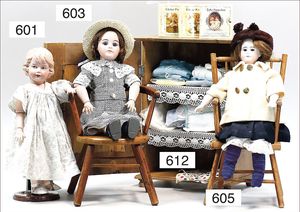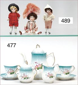 Puppenküche, Holz, Trapezförmig, Länge 1,16 m, Höhe 38 cm, Tiefe 54 cm, um 1910, mit reichh- Zubehör, Holzmobiliar, beige/blau bemalt, dazu 1 BING Herd, kompl., etwas Porzellan, 1 Blech-Brotdose, rund, einige Teile Steingut, Blecheimer mit Deckelaufschrif