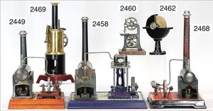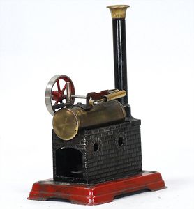 PLANK 2161/5, ca. 1914, kl. stehende Dampfmaschine, 27cm hoch, Kesseldurchm. 6cm, Kessel Messing poliert, Brenner, Pfeife, oszillierender Zylinder, Schornstein, Schwunggraddurchm. 5cm