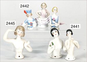 3 Porzellan-Halbpuppen, glasiertes Porzellan, 1 x Tänzerin, gemarkt 7144, 6 cm, 1 x gemarkt 5176, 6 cm, 1 x modellierter Hut, 5 cm