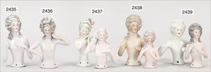 2 Porzellan-Halbpuppen, glasiertes Porzellan, mit schön ausmodellierter Frisur, bewegl. Arme, 1x Kopf seitl. blickend, mit anmodellierter Schleife, 10 cm, 1x seitl. blickend, 12 cm