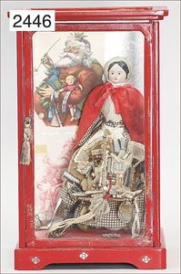 Biedermeier-Puppe, in Glasschrank, gekleidet als Hausiererin, mit Korb-Zubehörteilen, 36 cm x 19 cm