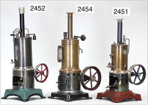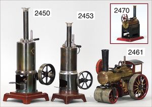 DOLL 320/5, ca. 1934, gr. Stehende Dampfmaschine, 41cm hoch, Kesseldurchm. 8cm, Messing brüniert, Sockel Guss, Wasserstandglas, Pfeife, Manometer, mit Schornstein und Brenner, guter Zust.