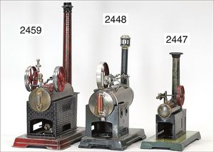 MÄRKLIN 4106/71/2, ca. 1912, stehende Dampfmaschine, 36cm hoch, Kesseldurchm. 8cm, Messing brüniert, Sockel Guss, Wasserstandglas, Pfeife, Schwungraddurchm. 9cm, Orig.-Brenner und Schornstein, guter Zust.