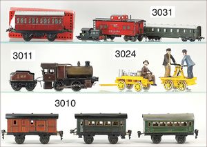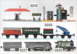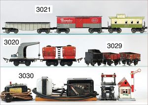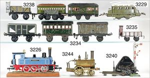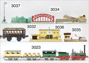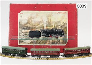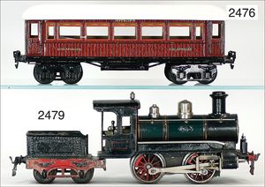 KARL BUB Eisenbahn, Uhrwerkantrieb intakt, Lok mit Tender und 3 Waggons, dazu einiges Gleismaterial, Spur 1