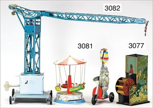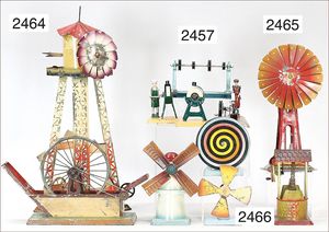 2 Teile, Antriebsmotor, Blech handlackiert, Nr. 1 Becker, ca. 1910, Schöpfrad, 30,5cm lang, Nr. 2 Bing, Windmühle, mit Klopfwerk, 10/2123, ca. 1930, 46cm, starke Lackfehler