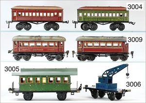 Konv. MÄRKLIN Spur 0, 4 Teile, 1722 Gepäckwagen, 1721, 2-achsiger Personenwagen, Kipplorewagen, bespielt, gut, dazu Kranwagen, farbl. Überarbeitet