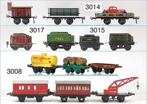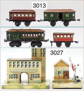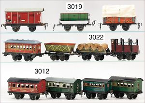 Konv. BING u.a., 4-achsiger Gepäckwagen, Spur 0, 17 cm, 4-achsiger Personenwagen 3. Klasse, 18 cm, kl. off. Güterwagen, off. Güterwagen mit Bremsehaus, Spur 1, bespielt bis gut