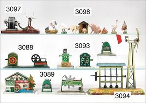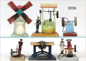 Konv. FLEISCHMANN, 6 Teile Antriebsmodell, Mann an der Wurstmaschine, Schmied, Säge, Brunnen mit Schöpfrad, Windmühle, Schleifstein, teils gut, teils Lackfehler