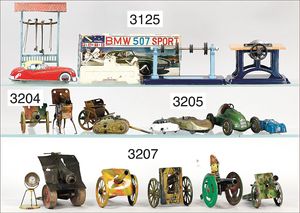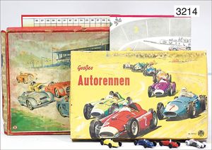 Spiele, 2 Teile, Großes Autorennen, Klee 9475/1, Brettspiel mit Anleitung und 4 Fahrzeugen im Karton, Autorennen 108/2, Brettspiel mit 4 Zinnfahrzeugen, Vorkrieg, mit Anleitung im Karton, Karton etw. zerschlissen, schönes Deckbild