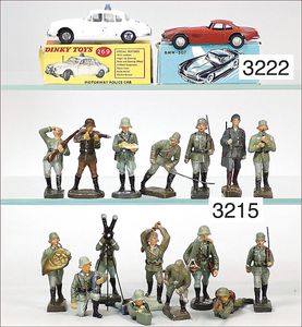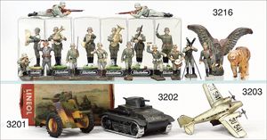 13 Teile, meist ELASTOLIN oder LINEOL, 7,5 cm, Masse, 2. Weltkrieg, kämpfend und marschierend, Zust. 2, dazu 6 Kunststoff-Figuren, Musiker, ELASTOLIN, sowie 2 Tierfiguren Masse, Adler und Tiger (kl. Beschädigungen)