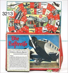 Konv. 2 Spiele, 1 x Die Luftreise, Speer und Söhne, Brettspiel mit 4 Zinn-Flugzeugen, mit Anleitung im Original-Karton, Karton etw. zerschlissen, dazu Das U-Boot-Spiel, einfaches Brettspiel im Original-Karton
