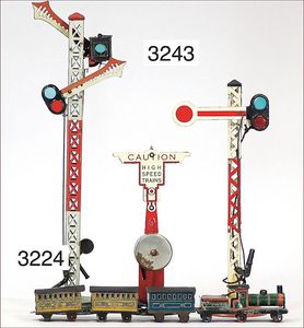 3 Teile Eisenbahnzubehör, BING Doppelflügelsignal, 34 cm, Flügelsignal, 27 cm, Schild: Attention High Speed Train, mit Glocke, Magnetantrieb, bespielt bis gut